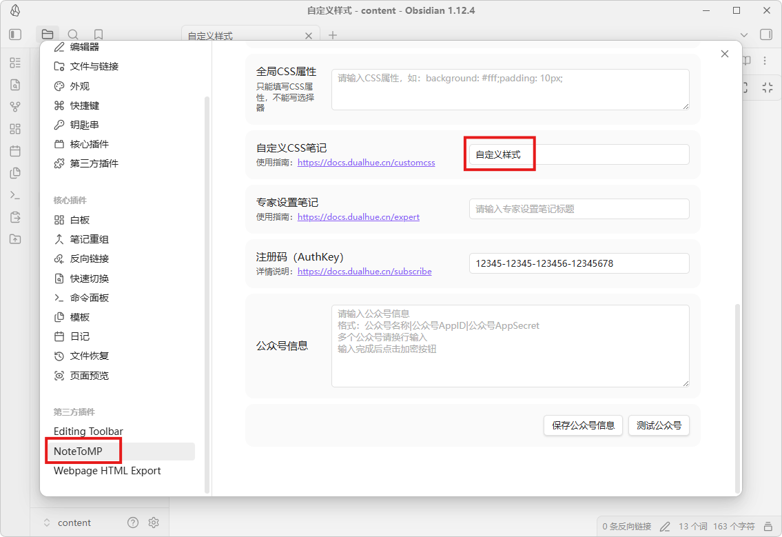 然后打开NoteToMP插件设置,将自定义样式(即包含自定义CSS内容的笔记名称),粘贴到自定义CSS笔记中即可。如果不使用自定义CSS,留空即可。