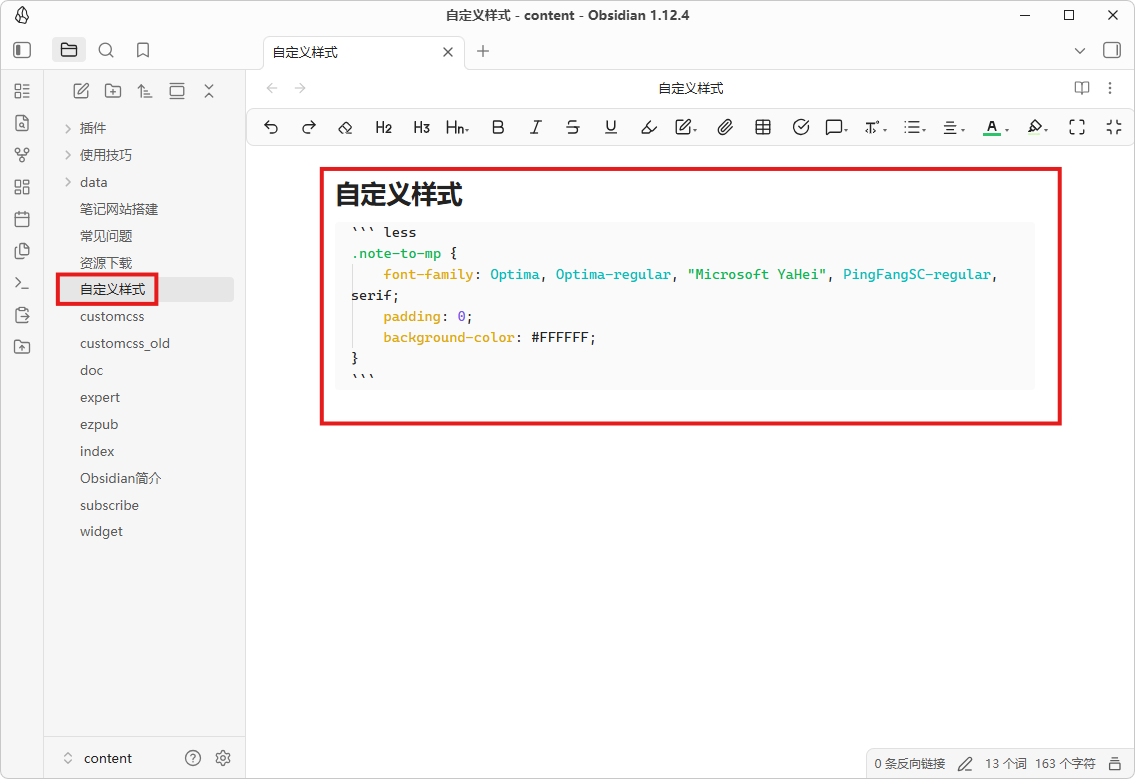 custom.css。使用笔记更方便管理样式,直接在Obsidian内即可调整更新。